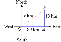 A ship sails 80 km due east and then 18 km due north. How far is the