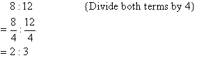 By dividing both terms by 4, we find 8 : 12 = 2 : 3