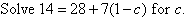 Use the Distributive Law, then subtract 14 from both sides, add 7c to both sides and finally divide both sides by 7 to find c = 3.
