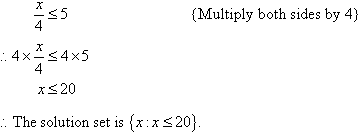 Multiply both sides by 4 to find x <= 20.  Therefore, the solution set is {x : x <= 20}.