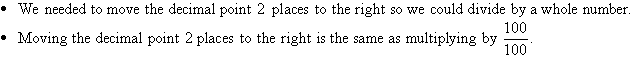 • Move the decimal point in the dividend to the right by the same number of places as the decimal point was moved to make the divisor a whole number.