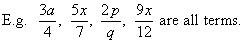 • The fraction formed by a number and a pronumeral or pronumerals is also called a term.