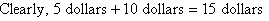 5 dollars + 10 dollars = 15 dollars